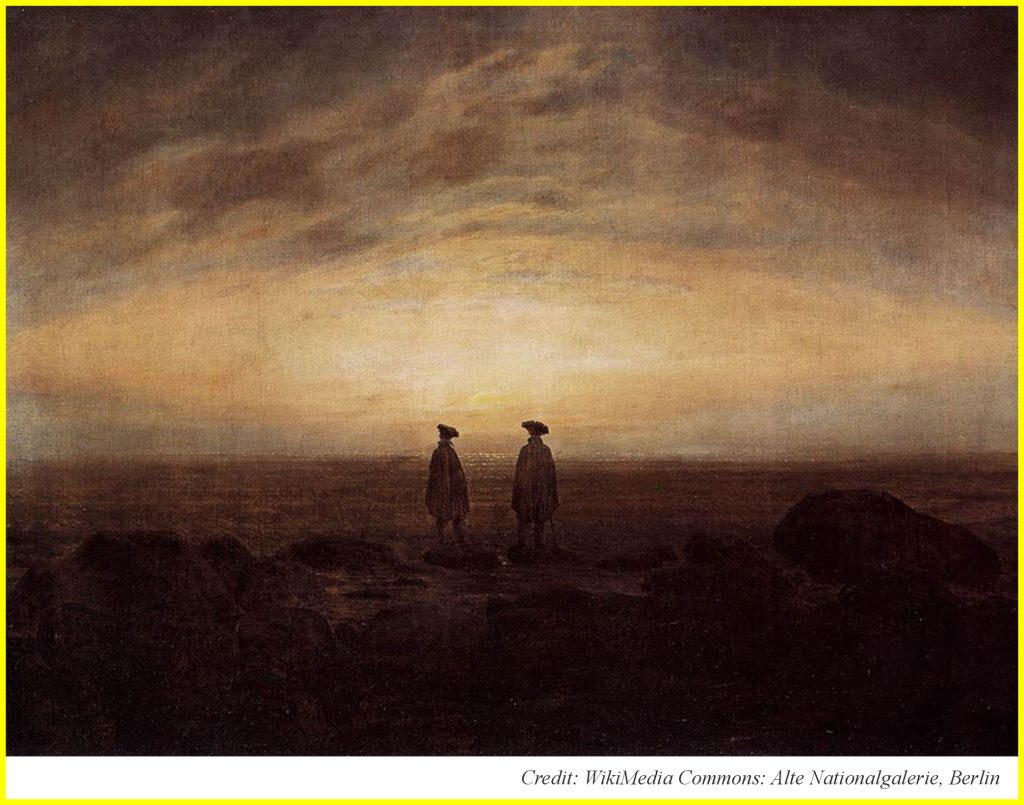 The canvas is a small one: 51 x 66 cms. It has been described as ‘a quintessentially spiritual Romantic painting,’ one which beckons the viewer to join the two standing, back-turned and silhouetted figures ‘in a wordless but deep emotional encounter with nature.’ They stand, their expressions closed to us, but evidently rapt in contemplation of the mystery and grandeur of an empty landscape, where an occluded moon rises above an expanse of darkly ominous sea.